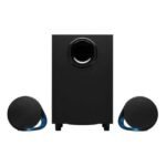 - Controles muy a mano. El control de volumen es frontal y central. El emparejamiento Bluetooth® se realiza con una simple pulsación. La tecla G programable circula por una gradación de color de forma predeterminada y también se puede programar para activar aplicaciones o ejecutar macros de juego vía LGS. El botón de encendido también está fácilmente accesible, en la parte posterior del altavoz satélite derecho.