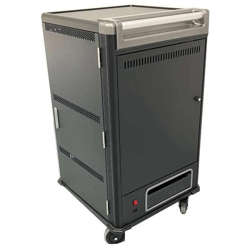 Armario de Transporte Metálico: Diseñado para alojar hasta 30 dispositivos electrónicos, este armario cuenta con ruedas con freno para fácil movilidad, estanterías ordenadas, y seguridad mejorada con cerraduras y protección eléctrica. Ideal para escuelas y oficinas, ¡mantén tus dispositivos organizados y seguros!