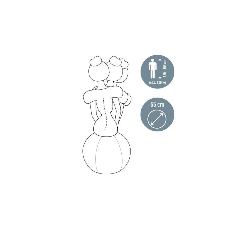 - Diámetro generoso de 55 cm con una robusta bola interior sin ftalatos, adecuada para alturas de entre 135 y 155 cm y una carga máxima de 120 kg