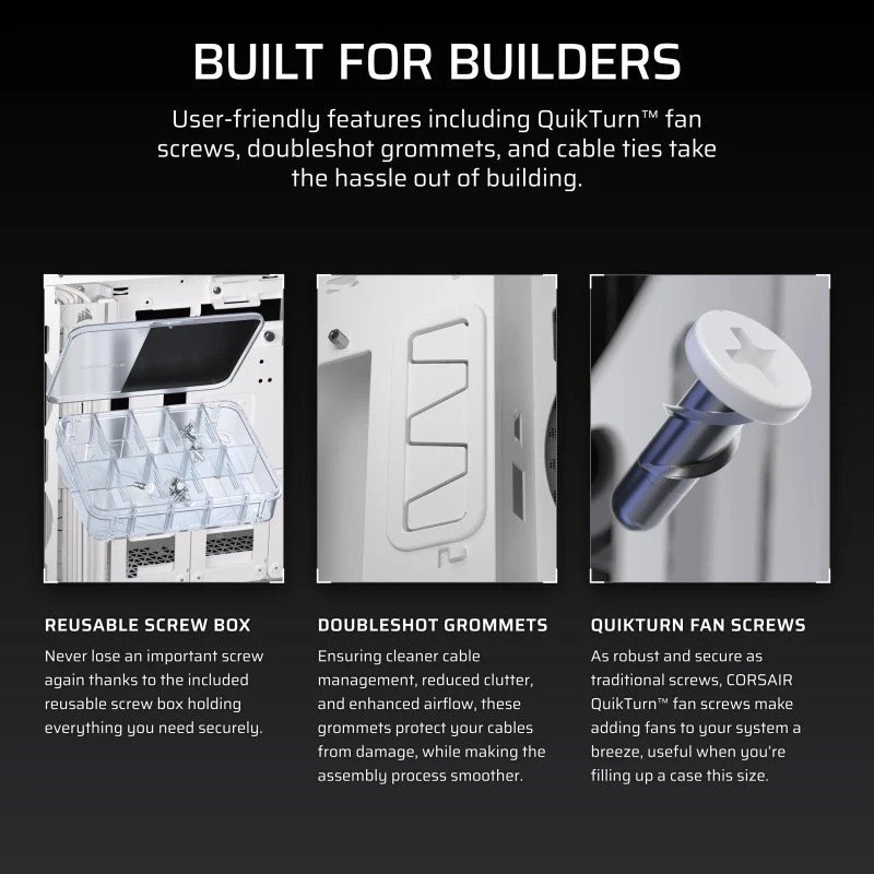 - Características amigables para el ensamblador – Una gama de innovaciones de CORSAIR mejora la experiencia de construcción, incluyendo soporte para montaje vertical sin brackets adicionales, tornillos Quikturn de un giro, pasacables flexibles de doble inyección y cortes externos para la gestión de cables.