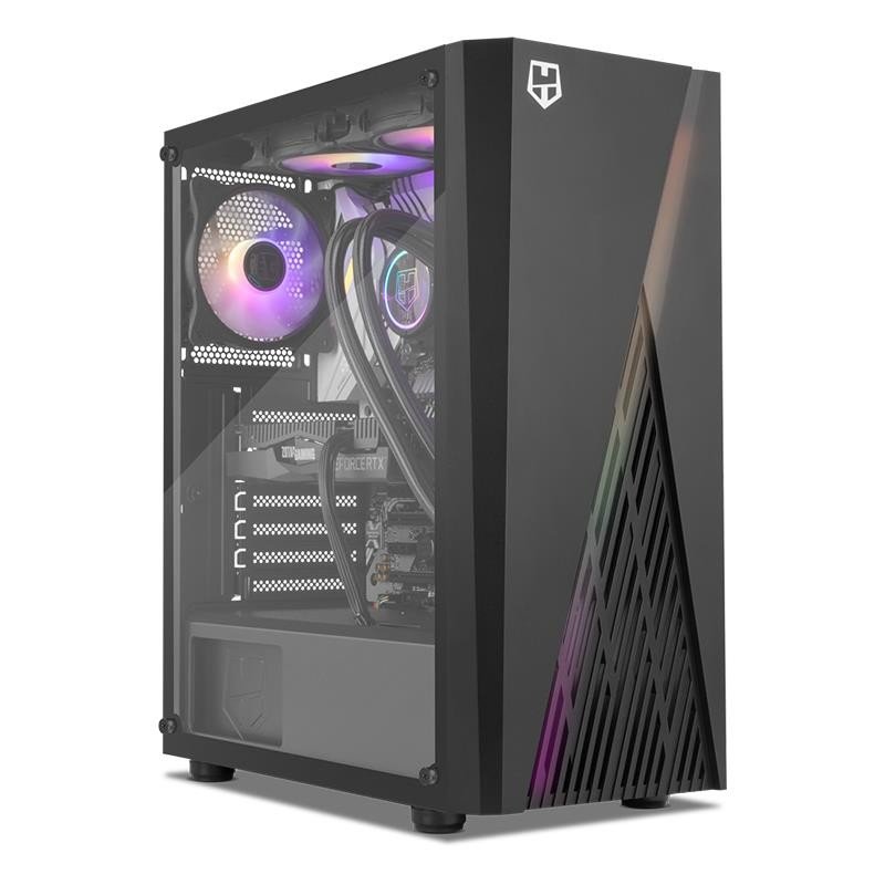 Semitorre con diseño gaming Nox Hummer Frost con tira frontal LED ARGB Rainbow, ventana lateral de cristal templado, capacidad hasta 6 ventiladores de 120 mm, principales puertos a mano y compatible con gráficas de gran tamaño.