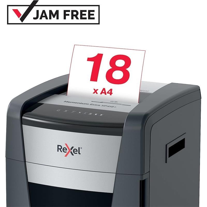 Las destructoras de papel sin atascos Rexel Momentum Extra son ideales para destruir documentos confidenciales en la oficina. La destructora XP418+ destruye hasta 18 hojas de papel A4 (80 grs) de una sola vez a través de la ranura de alimentación manual en partículas P-4 (4x35mm). La tecnología de detección activa mide el número de hojas que se alimentan en tiempo real para detener los atascos y los errores de alimentación del papel; se indica mediante un LED rojo en el panel de control.