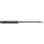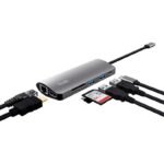 Elegante adaptador multipuerto en aluminio para añadir puertos HDMI, de red, lector de tarjetas, USB-C y USB al portátil utilizando una única conexión USB-C