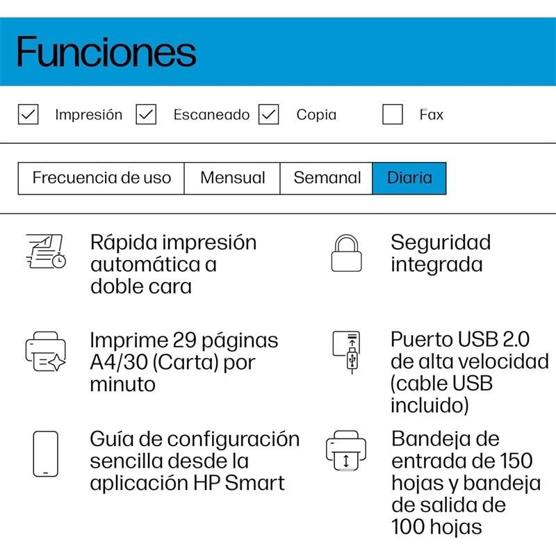 La HP LaserJet MFP M234d es una impresora multifunción láser diseñada para satisfacer las necesidades de pequeñas y medianas empresas que exigen alta productividad y calidad en cada documento. Su diseño compacto y galardonado permite integrarla en cualquier espacio de trabajo, mientras que sus funciones integradas de impresión, copiado y escaneo en blanco y negro la convierten en la solución ideal para oficinas que desean eficiencia y rendimiento.