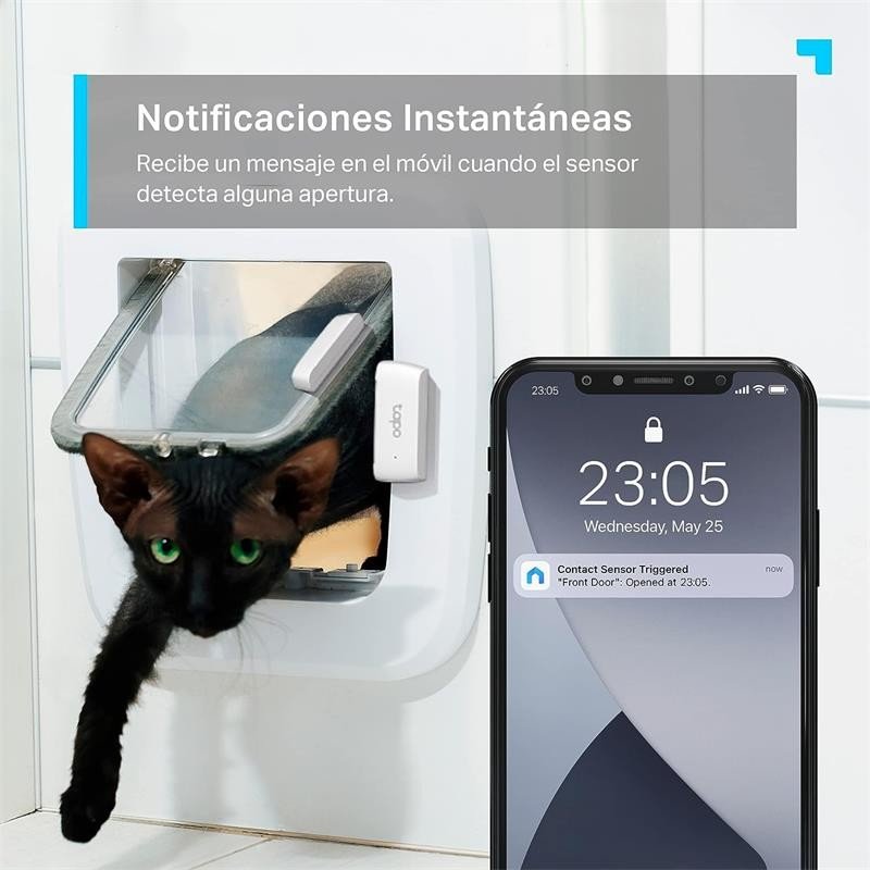 • Notificaciones instantáneas. Recibe en el móvil un mensaje cuando el sensor se active para saber que ocurre en casa.