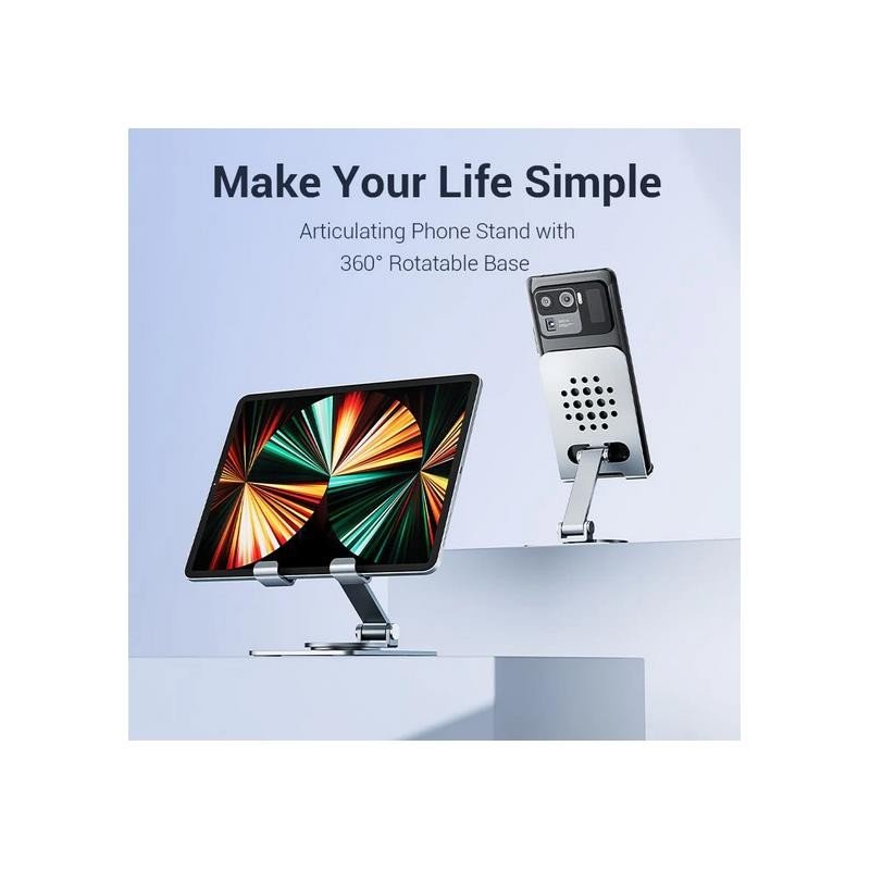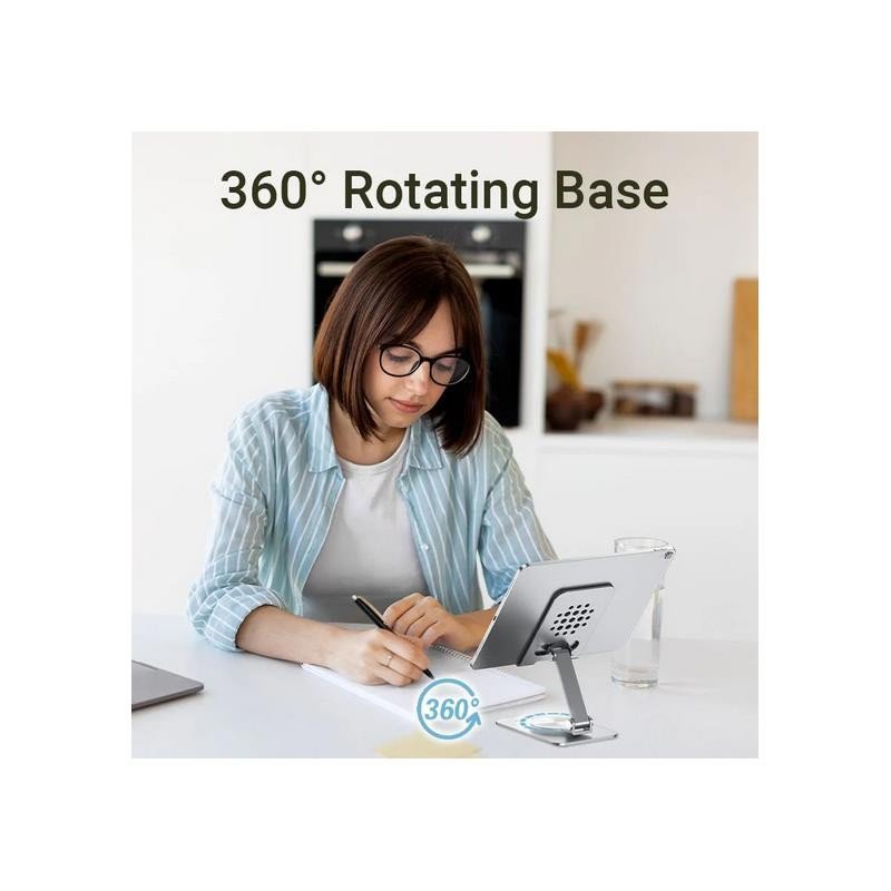 Base giratoria de 360°: Permite cambiar la orientación del dispositivo con facilidad, adaptándose a diferentes actividades como escribir, leer o presentar.