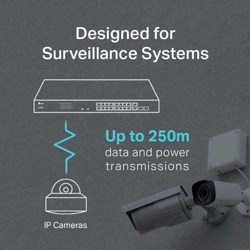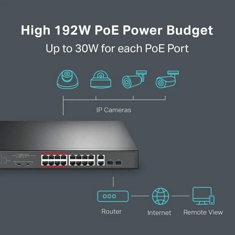 • Switch PoE + de 16 puertos dedicado (presupuesto de 250 W) para numerosas aplicaciones: El cumplimiento del estándar 802.3af / at PoE + admite hasta 30 W en cada puerto PoE. El presupuesto total de energía PoE de 250 W * para los 16 puertos PoE + hace que tenga una amplia gama de aplicaciones, como vigilancia, oficinas, dormitorios y pequeñas empresas. Es totalmente compatible con cámaras IP, puntos de acceso, teléfonos IP, computadoras, impresoras, etc.