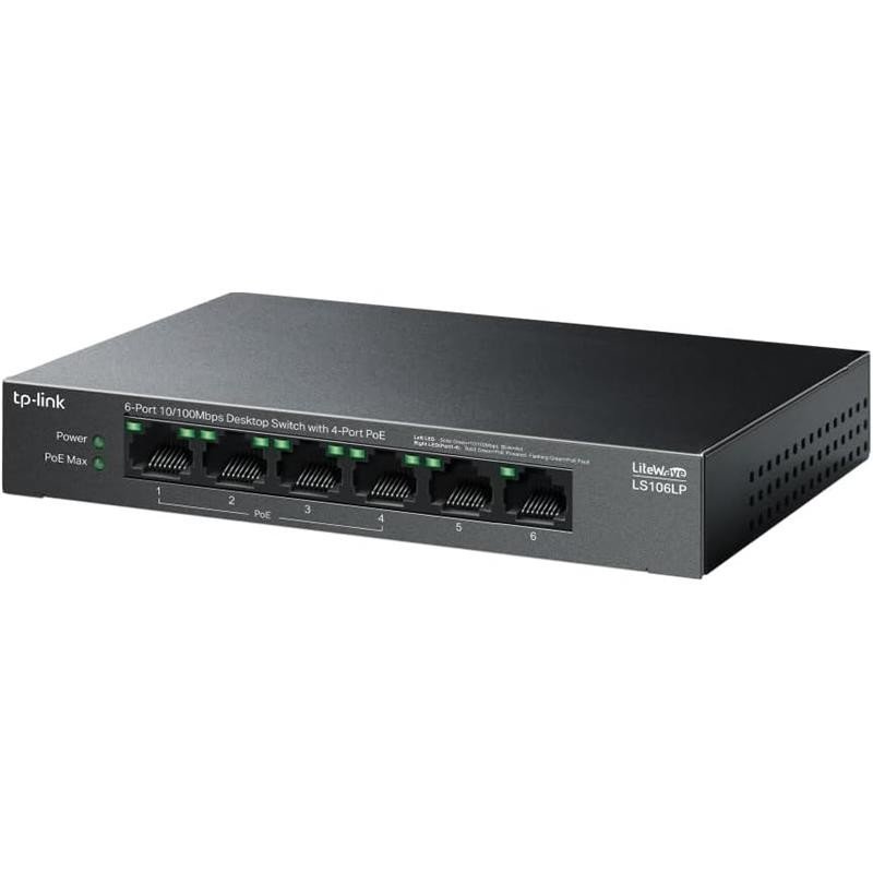 El TP-Link LiteWave LS106LP está equipado con 6 puertos RJ-45 Ethernet de tipo Fast Ethernet, capaces de soportar velocidades de 10/100 Mbps. Este switch posee una tabla de direcciones MAC con capacidad para 2000 entradas y una capacidad de conmutación de 1,2 Gbit/s, ofreciendo una rápida y eficiente gestión del tráfico de red.