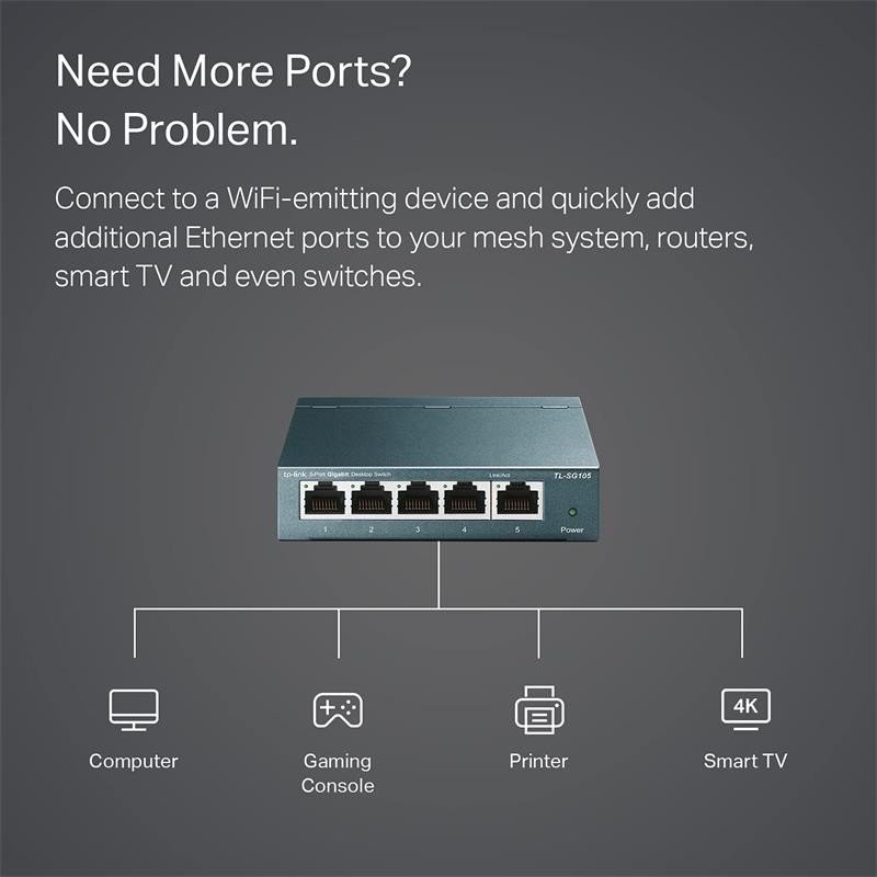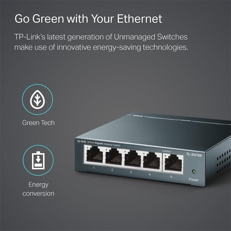- Hazte Verde Con Tu Ethernet. ¡Ahora tienes la opción de ser ecológico al actualizar a una red gigabit! Esta nueva generación de switches de escritorio TL-SG105S de 5 puertos a 10/100 / 1000Mbps presenta las últimas tecnologías innovadoras de eficiencia energética que pueden ampliar en gran medida la capacidad de tu red con mucha menos energía. Ajusta automáticamente el consumo de energía de acuerdo con el estado del enlace y la longitud del cable para limitar la huella de carbono de tu red.