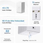 - Conectividad 4G y Wi-Fi: Permite acceso a Internet en cualquier lugar usando una tarjeta SIM 4G y es compatible con hasta 32 dispositivos simultáneamente, con velocidad Wi-Fi de hasta 300 Mbps (Wi-Fi 4 en banda de 2.4 GHz).